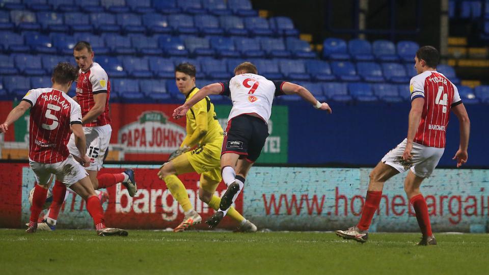Wanderers were unfortunate not to take the lead on the half-hour mark after Ben Tozer steered Isgrove’s flick from Gethin Jones’ cross goalwards. Griffiths was wrong footed but somehow managed to get a hand on the ball to turn it away for a corner.